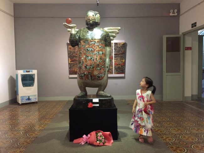 Tác phẩm Human của Đinh Văn Sơn có lẽ là một ví dụ sinh động cho tinh thần đổi mới. Đây là một tượng gốm/điêu khắc rồi phủ sơn mài – dù triển lãm tập trung vào “tranh sơn mài”. Có lẽ tác giả phải đổ khuôn tượng xong rồi dùng sơn mài bọc vải lên như cách làm vóc, rồi vẽ thật mỏng, vì vẽ dày sơn sẽ chảy, do chậm khô. Sau đó cẩn trứng, xuống bạc, ghè màu… Nói chung rất công phu, sơn mài mà không hẳn sơn mài. “Tôi cũng không hiểu tại sao tác phẩm của mình lại được ưu ái chấm giải Nhì nữa, khá là bất ngờ. Có lẽ đây là một dạng đầu tư khuyến lệ từ ban tổ chức, nhằm phát huy sự sáng tạo với chất liệu truyền thống” – Đinh Văn Sơn nói.