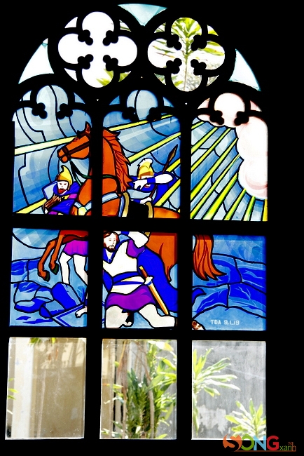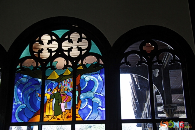Một điều đáng nói khác, như là sự tương phản và nổi bật lên trên gam nhu trầm của gỗ trăm năm, là các tấm kính màu, vẽ hình ảnh các tích trong Kinh Thánh và cũng là chỗ lấy ánh sáng bên trong nhà thờ. Nắng soi qua kính tạo những màu sắc đẹp như bức tranh được đóng khung gỗ quý treo trên trần nhà, gợi cảm giác vừa quen vừa lạ. Quen vì các hàng cột đặc trưng của kiến trúc Roman, và kính màu rất hay được sử dụng ở các nhà thờ trong giai đoạn này, lạ vì nó nằm giữa không gian gỗ đậm nét vùng dân tộc thiểu số, không chỏi, vênh mà lại rất hài hòa.