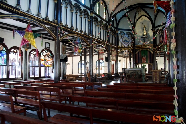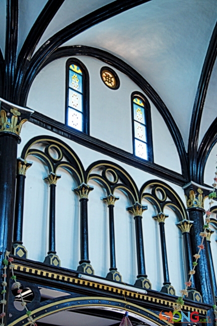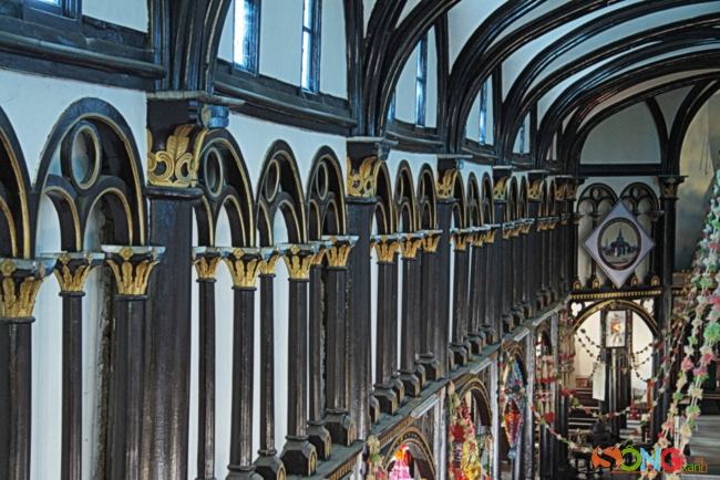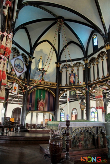 Bạn có thể thấy rõ loại gỗ quý hiếm này ở những hàng cột đen tròn, thẳng tắp chạy dọc bên trong và hai bên hành lang giáo đường. Từ cột kèo đến nóc nhọn của giáo đường, mái vòm cong, cửa, ghế, hay cả tháp chuông cao cao đều làm bằng gỗ. Gỗ được đục đẽo, gắn kết nhau bằng mộng, không có sự hiện diện của đinh hay vật dụng hỗ trợ đóng ghép gì khác nên khối kiến trúc này càng thêm đặc biệt.