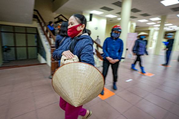 Hơn 10h sáng tại Đình Thần – Bình Lợi Chung nhiều người nghèo đã nhanh chóng xếp hàng ngay ngắn tại những ô vạch sẵn với khoảng cách 2 mét, đeo khẩu trang, rửa tay sạch sẽ đợi đến lượt mình để nhận gạo, muối, đường, nước tương…