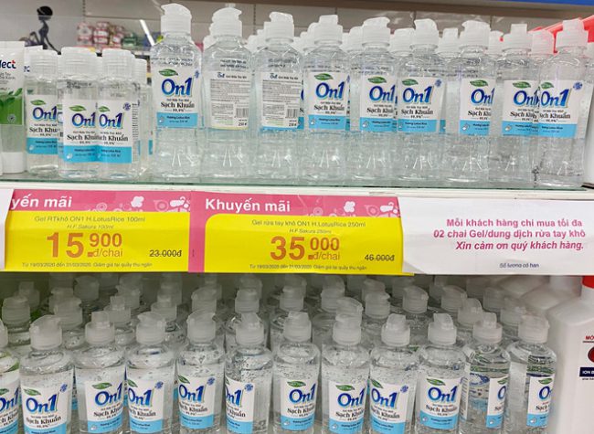 Tại một siêu thị ở TP.Thủ Dầu Một (Bình Dương) hiện bày bán sản phẩm On1 với nhiều loại khác nhau, có giá dao động từ 35.000 – 91.000 đồng/sản phẩm. Tuy nhiên, mỗi người chỉ được mua 1 sản phẩm bất kỳ loại lớn hoặc nhỏ. Trên mỗi chai On1 đều có nhãn mác ghi “Sạch khuẩn 99,9% (*) ở mặt trước và mặt sau có ghi công dụng của sản phẩm: “Dùng để làm sạch khuẩn nhanh, vô trùng tay hằng ngày. Đặc biệt sau khi tiếp xúc với động vật, sau khi ho, hắt hơi và sau khi đi vệ sinh”. Đáng chú ý, trên nhãn mác ở mặt sau có ghi dòng chữ rất nhỏ để giải thích dấu (*) là: “Dựa trên kết quả thực nghiệm tại phòng thí nghiệm”.