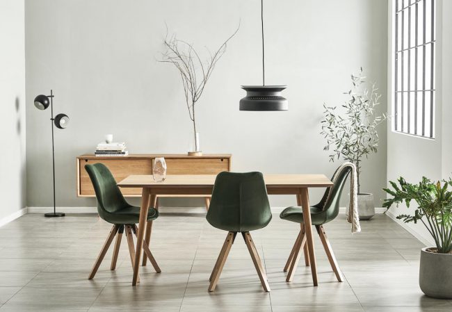 Không gian sẽ bừng sáng với bộ bàn ăn tròn, chân gỗ sồi thanh lịch. Kết hợp với bộ ghế bọc bằng vải nhung màu xanh lá, chân gỗ đồng màu.