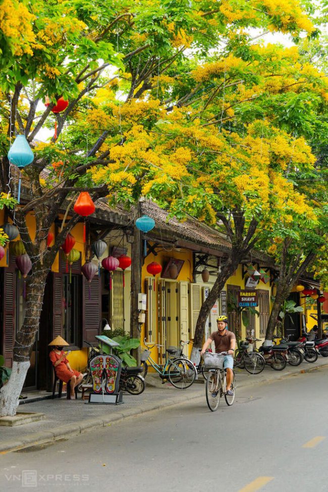 Những hàng sưa trổ hoa vàng rực trên những tuyến phố tĩnh lặng hiếm thấy mang lại vẻ đẹp khác lạ cho Hội An.