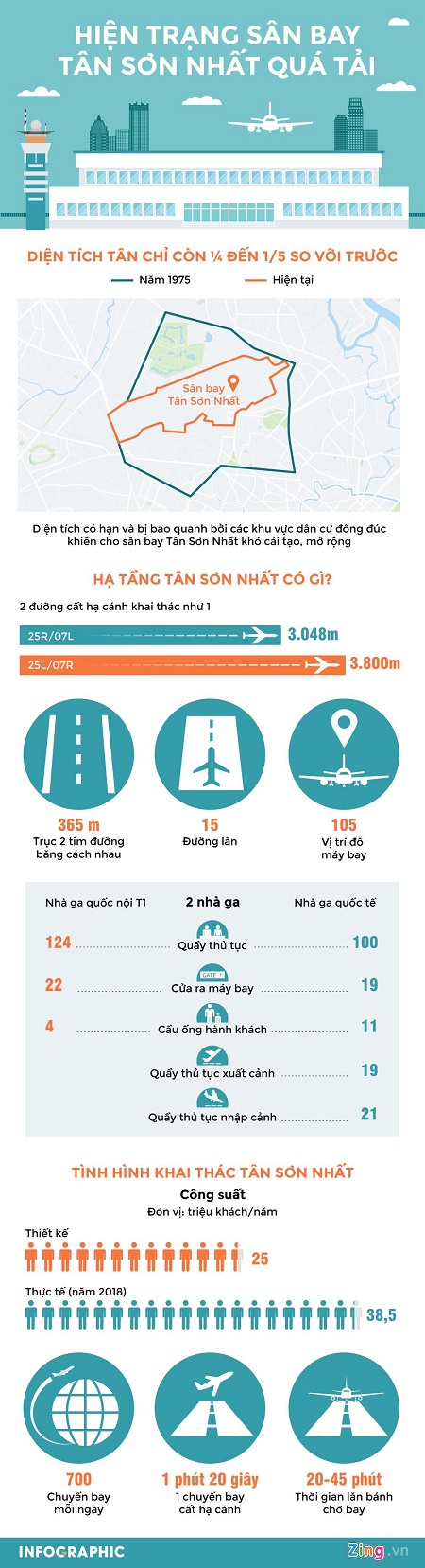 Công suất thiết kế 25 triệu khách/năm nhưng năm 2018, sân bay quốc tế Tân Sơn Nhất đón 38,5 triệu lượt khách. Trong khi đó, diện tích Tân Sơn Nhất chỉ còn 1/4 – 1/5 so với trước đây.