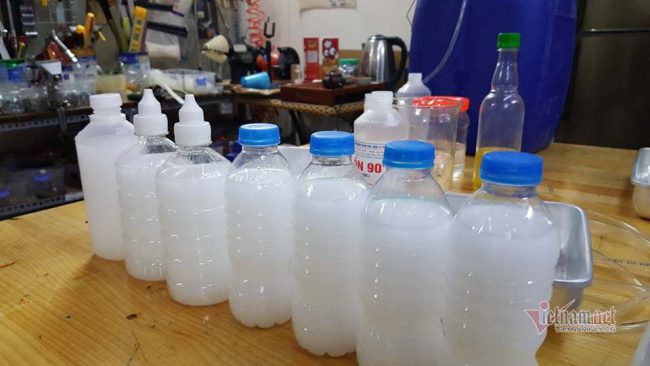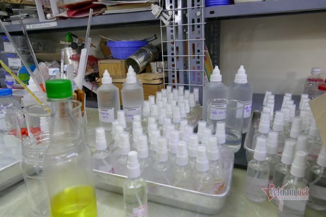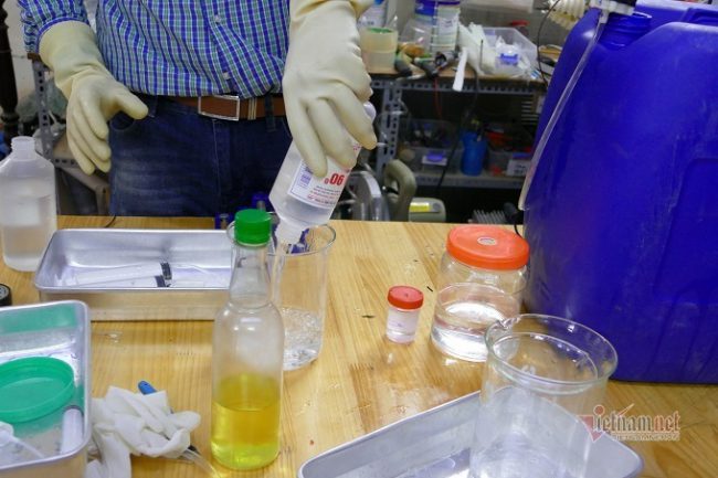 Nguyên liệu được nhóm anh Hiếu mua từ trường Đại học Y Hà Nội và pha chế theo công thức của WHO.