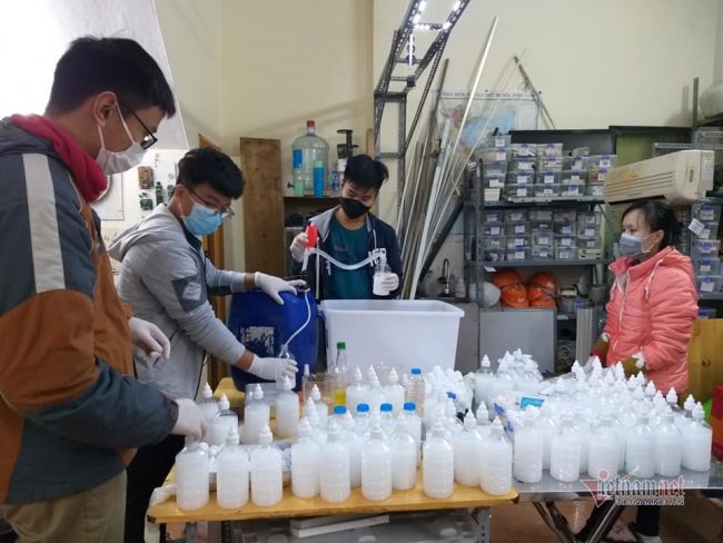 Ban đầu chúng tôi chưa có ý tưởng này nhưng khi tình trạng khan hiếm nước rửa tay khô và khẩu trang xảy ra, chúng tôi đã nhờ đến sự hỗ trợ của thầy giáo Hiếu, gấp rút sản xuất 2.400 chai nước rửa tay, chuyển lên biên giới trong 5 ngày.