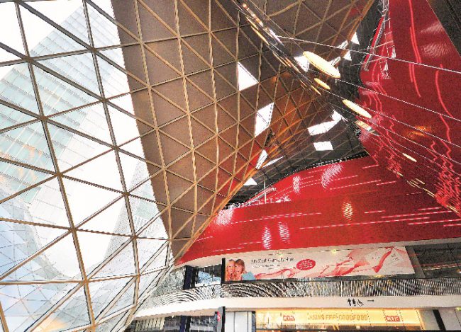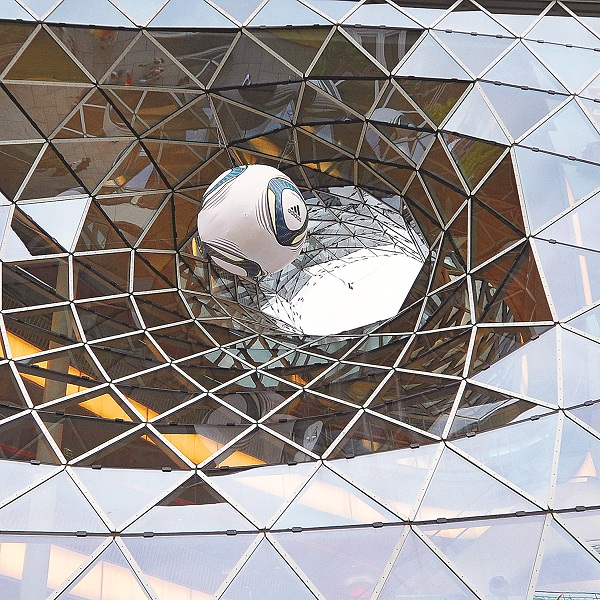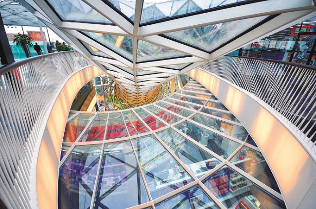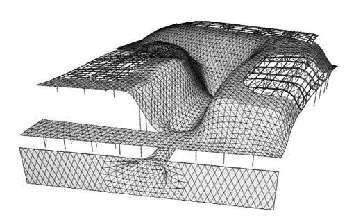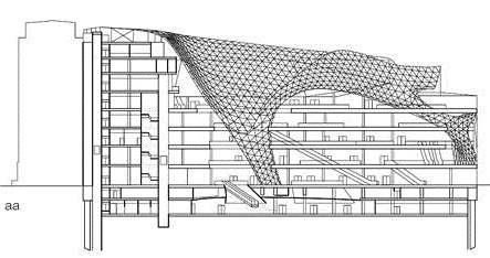 Điểm mấu chốt của công trình là hệ mặt tiền – mái liên hoàn từ thép và kính này không chỉ là lớp vỏ bọc với chức năng che mưa nắng, lấy sáng mà cũng chính là một phần của kết cấu chịu lực chính. Các thanh nối từ thép ống 60/120mm có độ dài trung bình 2,30 tạo nên một lớp vỏ dạng lưới mỏng chắc chắn với các mắt lưới dạng tam giác. Thông qua hai nút chính: một ở tầng trệt và một ở mặt tiền chính, lớp mái khổng lồ được căng với nhịp dài nhất lên tới hơn 50m. Thêm vào đó, toàn bộ lượng nước mưa từ mái cũng được thu lại thông qua chiếc “phễu” này và tái sử dụng cho quá trình vận hành của toà nhà.