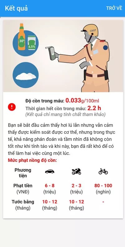 Cùng với những thông tin như trên, ứng dụng cũng cảnh báo khung xử phạt hành chính tương ứng với mức độ cồn đó là từ 6 – 8 triệu đồng, tước bằng lái xe từ 10 – 12 tháng nếu chạy ôtô; từ 2 – 3 triệu đồng, tước bằng từ 10 – 12 tháng đối với xe máy và phạt từ 80.000 – 100.000 đồng đối với xe đạp.