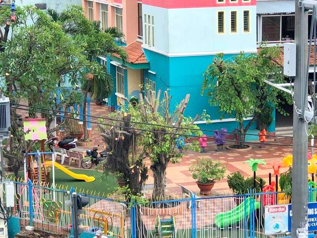 Một trường tiểu học khác gần đó, có vài bóng cây hiếm hoi, cũng bị tỉa sạch cành không thương tiếc. Trông như vừa có trận bão càn quét qua vậy.