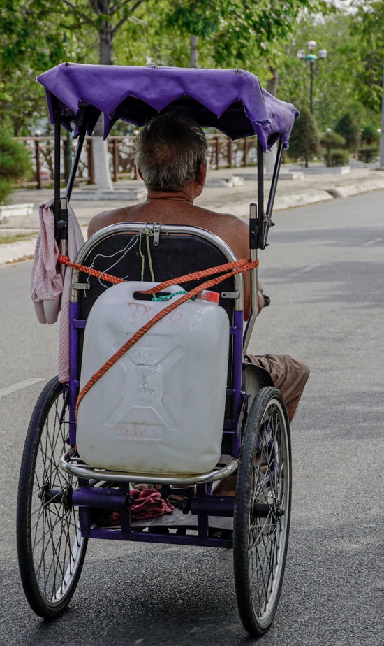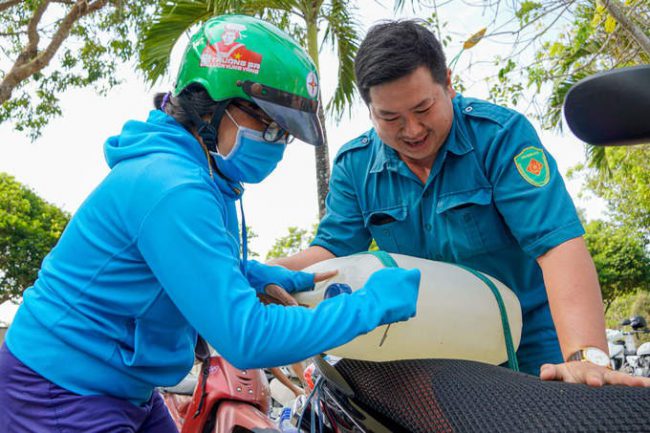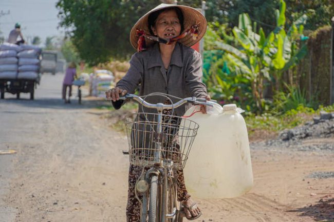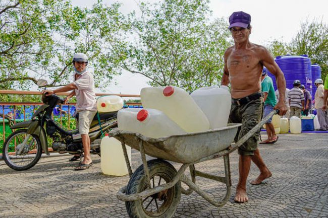 Nước máy lẫn nước sông đều mặn chát, người dân ở Tiền Giang, Bến Tre hàng ngày sống nhờ vào những can nước xin từ điểm cấp miễn phí.