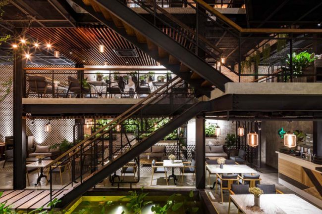 Lê House đã có ý tưởng “Vườn treo Babylon” khi thiết kế quán cà phê phủ đầy thực vật này ở Hà Đông – một quận ngoại thành Hà Nội từ một xưởng công nghiệp cũ.