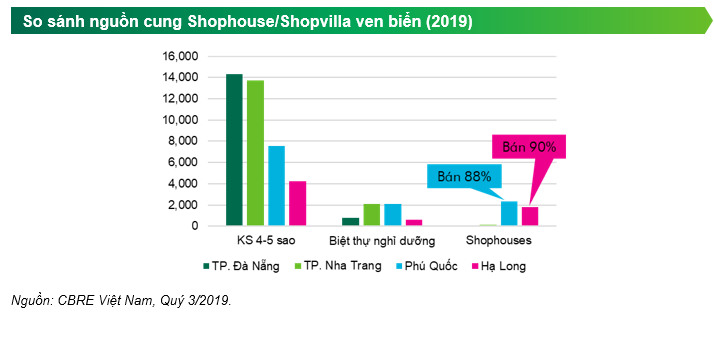 Tính đến tháng 9/2019, hai thị trường này lần lượt có trên dưới 2.000 sản phẩm thuộc loại hình shophouse/shopvilla ven biển, với mức tiêu thụ đạt gần 90%.